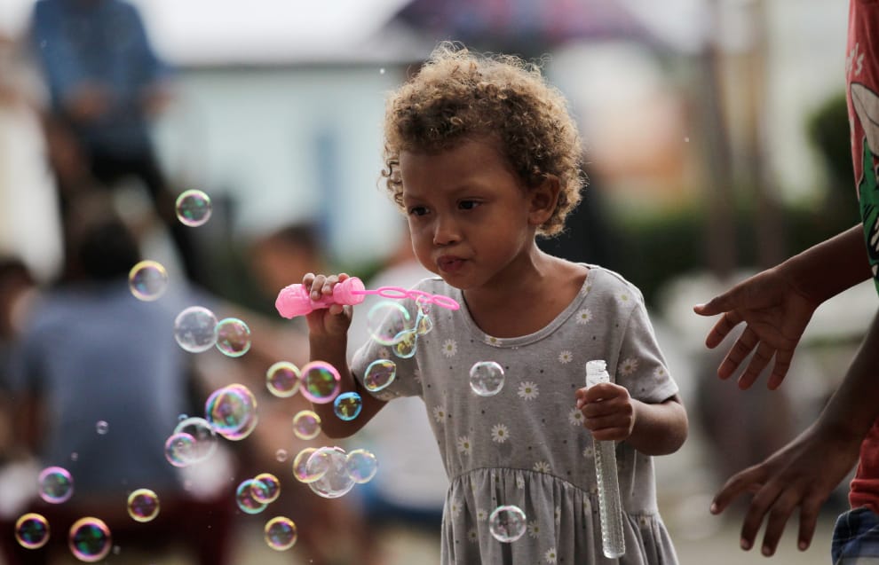 在墨西哥南部的馬帕斯特佩克鎮(Mapastepec),一名難民小女孩正在營地裡吹泡泡。最近,這名小女孩和她的親人一起踏上了北徙之旅,一路朝墨西哥首都墨西哥城前進,希望能在那裡得到庇護資格。