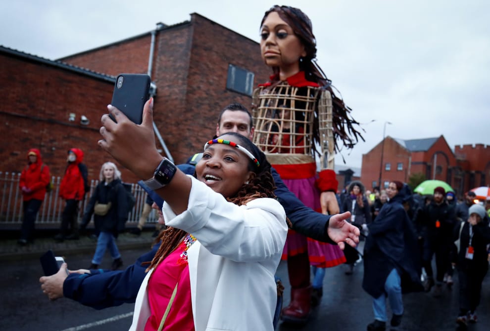 在英國西北部的維根鎮(Wigan),一名女子舉起手機,與身後高約 3.5公尺的木偶小阿莫(Little Amal)拍照。