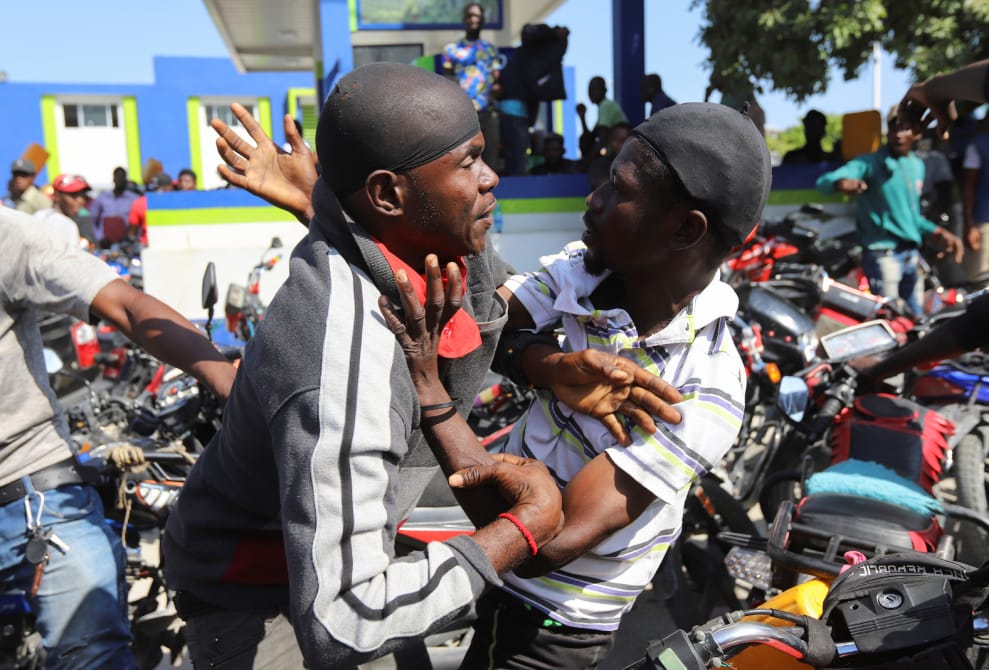 在海地首都太子港(Port-au-Prince),兩名排隊買汽油的男子在加油站外大打出手。