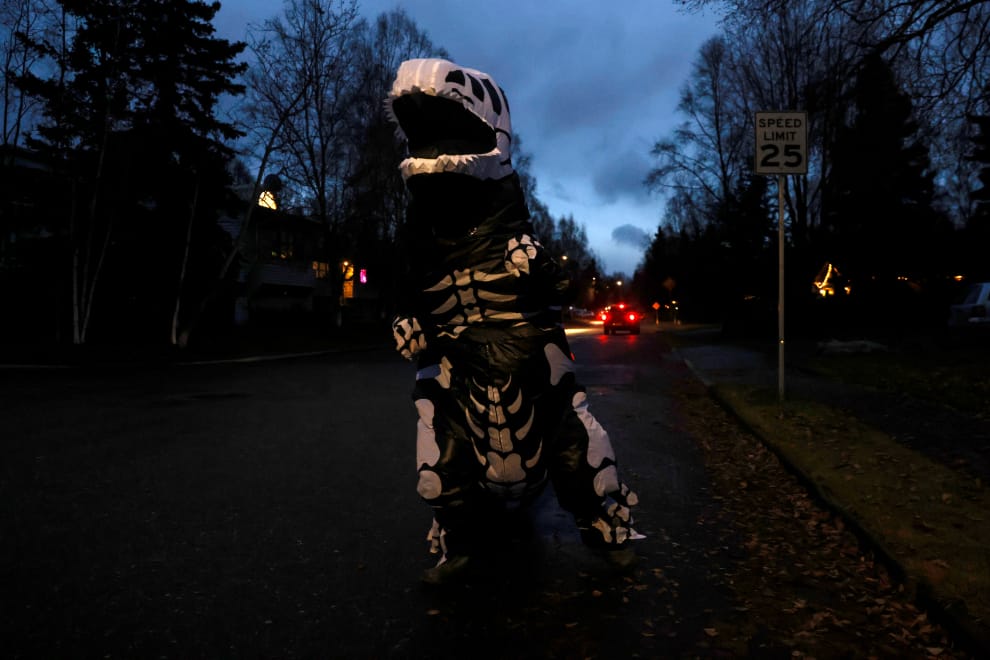 在美國阿拉斯加州的安克拉治(Anchorage),一位民眾穿上恐龍裝,上街參加萬聖節遊行。