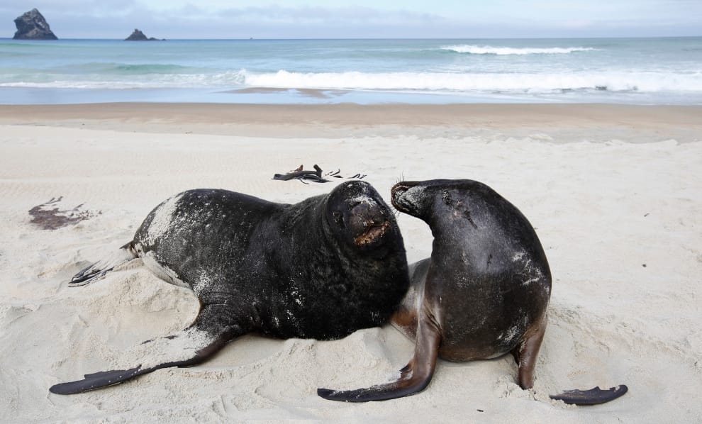 紐西蘭海獅重新出現在本島的消息,一方面令動保人士感到興奮,另一方面卻也令人十分擔憂。圖為兩頭出現在沙灘上的紐西蘭海獅。