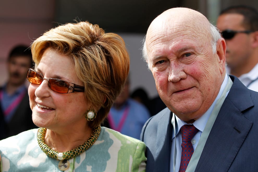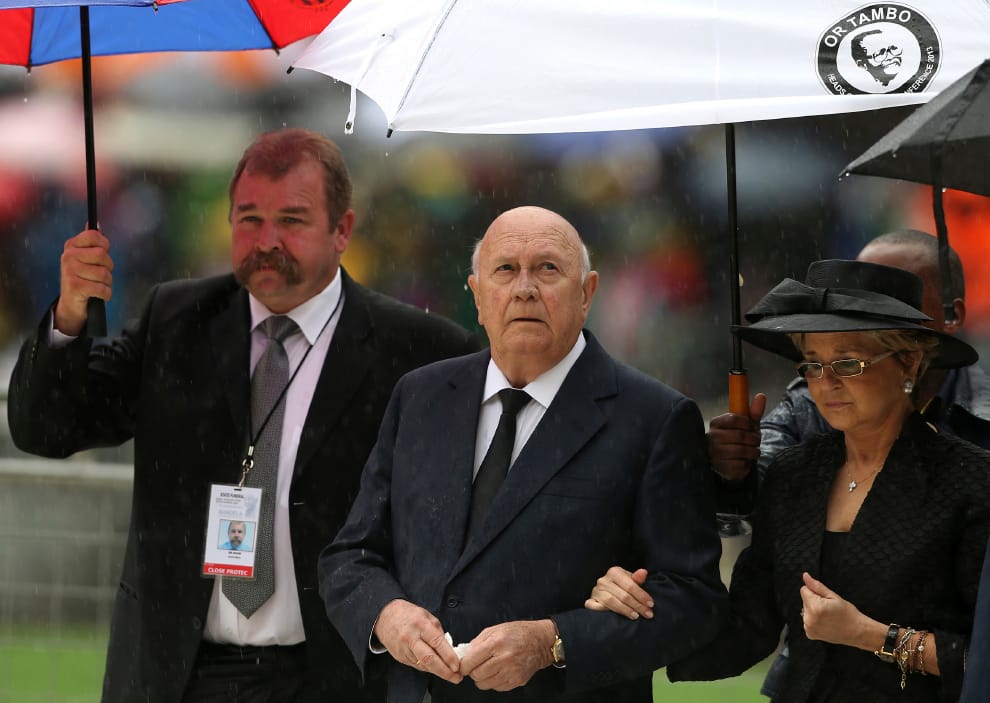 戴克拉克(圖中)於本周四辭世,並留下「最後的訊息」。本照攝於 2013年12月,曼德拉於該月 5號辭世,畫面中,戴克拉克與妻子伊莉塔(圖右)一起來到約翰內斯堡的足球城體育場(FNB Stadium)參加他的官方哀悼儀式。