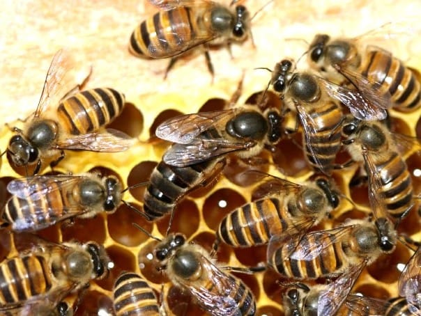 當大黃蜂徘迴在蜂巢入口時,東方蜜蜂的「尖叫聲」將來到巔峰。本照為東方蜜蜂,畫面中央是牠們的蜂后。