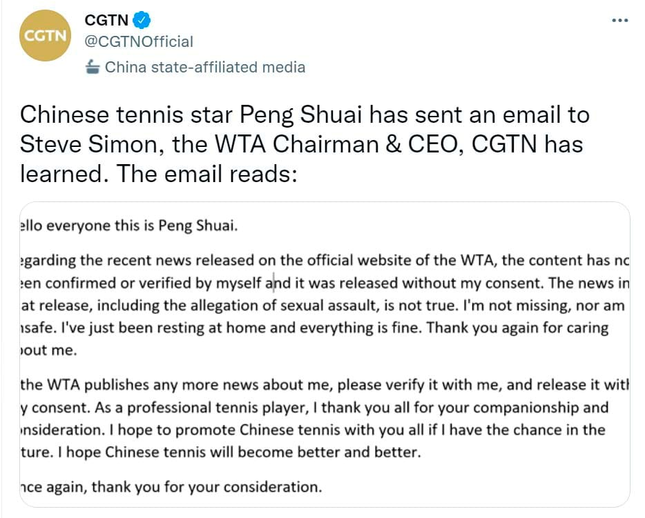 本周三(17),中國官媒《中國環球電視網》(CGTN)在Twitter上發布了一封「來自彭帥」的信,指稱這是要給國際女子網球協會(WTA)主席的訊息。