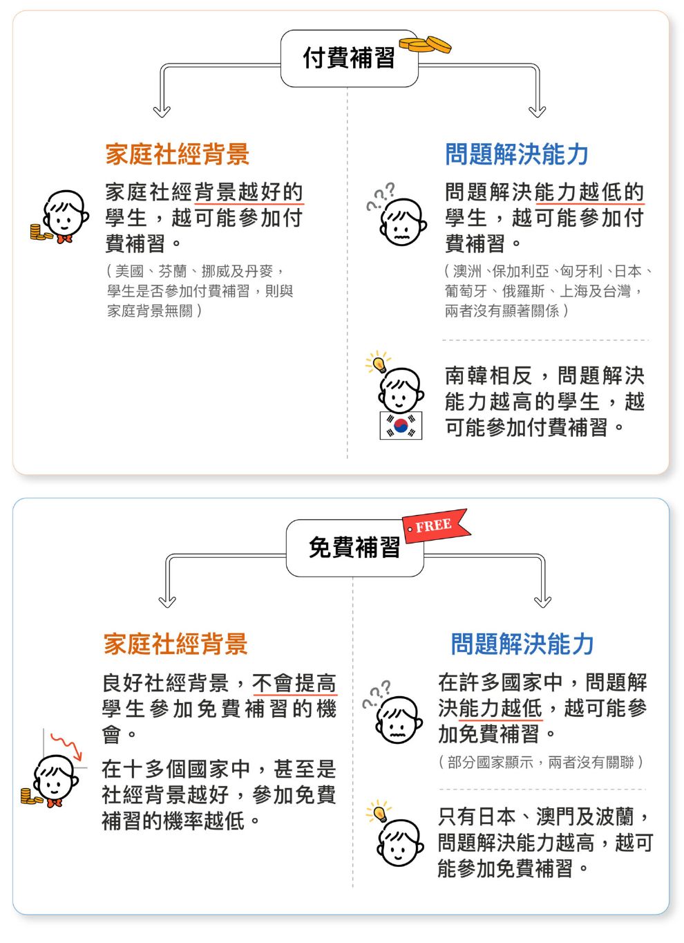 其他 17 個國家地區,包含台灣、南韓、香港、新加坡等,高家庭社經背景的學生並沒有因為問題解決能力較低,而提高付費補習的可能。此外,在南韓及台灣還呈現相反的結果,家境良好的學生中,能力越好越可能參加付費補習,顯示菁英主義的現象。黃敏雄推測,當學業成績與未來的教育、職業機會高度相關,高社經父母為了確保子女能保持領先,不論孩子能力高低,都會積極提供付費補習機會。