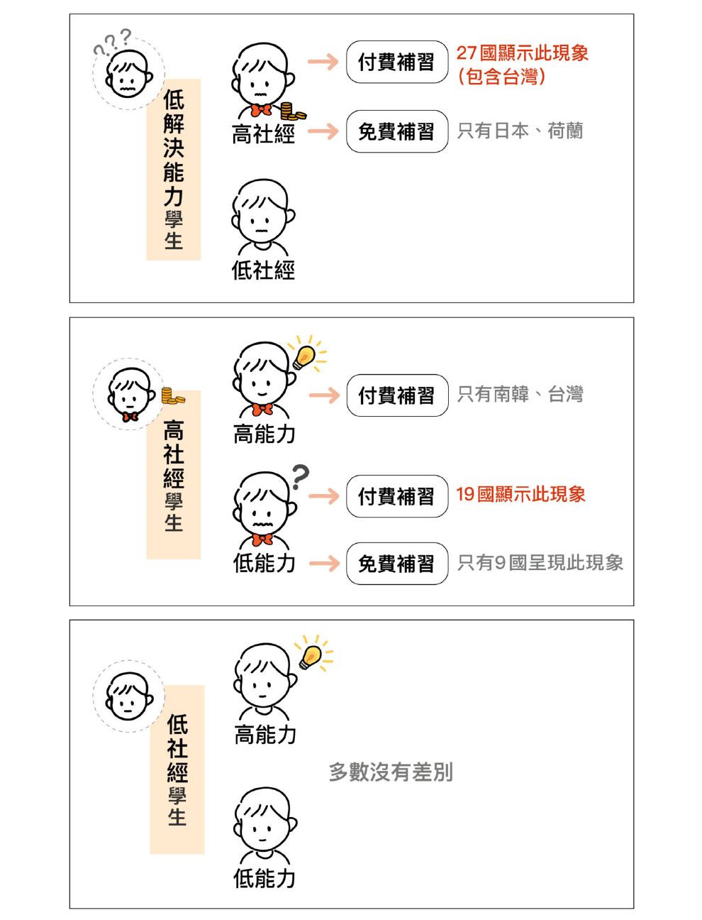 在多數國家中,問題解決能力比較低的學生裡,高社經背景者更可能去補習;高社經家庭的孩子中,問題解決能力較低的比較可能去補習;低社經家庭的孩子裡,不論能力高低,補習機率都沒有顯著差別。