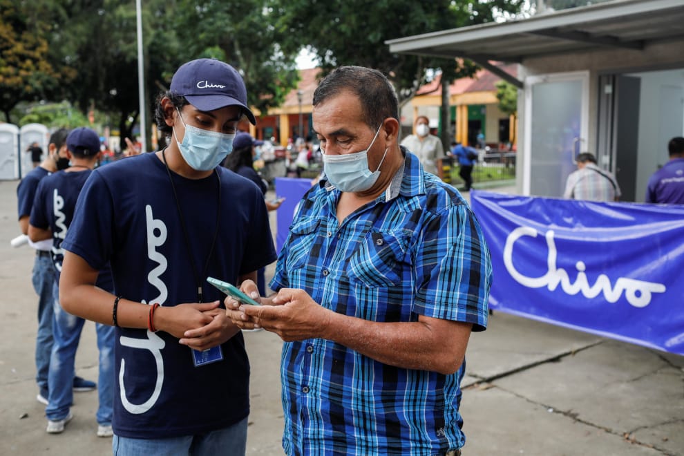 薩爾瓦多公共政策專家卡斯塔內達形容,於薩爾瓦多政府來說,比特幣就像是一個B計畫一樣。圖為一名奇沃錢包的員工,正在協助一名男子將持有的比特幣兌現為美元。