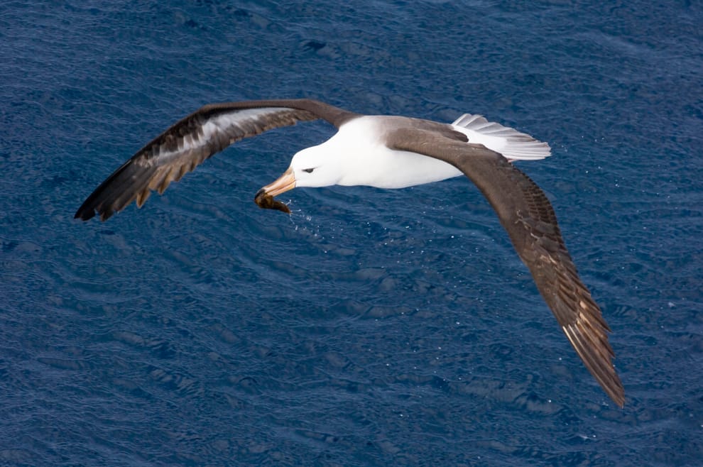 研究團隊發現,信天翁夫妻的離婚率其實與該年表層海面溫度的高低有關。圖為一隻飛行中的黑眉信天翁。