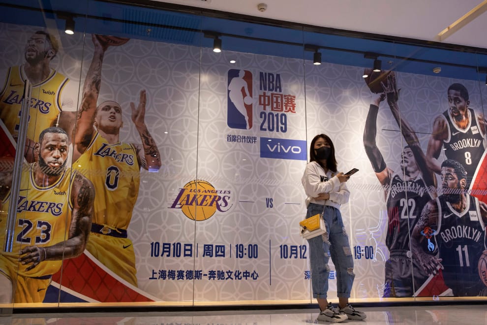 近年來,NBA、英超都曾觸怒中國網友,連賽事轉播都受到影響。圖為2019年至中國舉辦中國賽的湖人隊(Lakers)、籃網隊(Nets)宣傳展板。