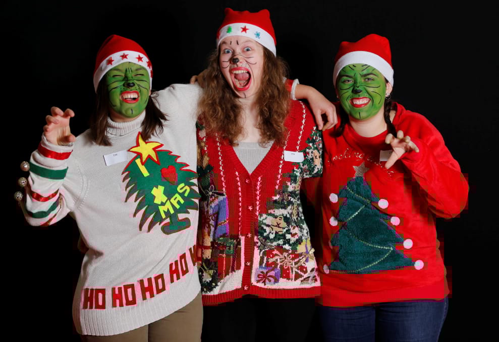 在2017年於法國舉辦的「醜毛衣冠軍錦標賽」( Ugly Sweater World Championship)上,三位穿上聖誕醜毛衣的參賽者一起拍了張合照。左起:卡桑德拉(Cassandra)、寶琳(Pauline)和艾蜜莉(Amelie)。