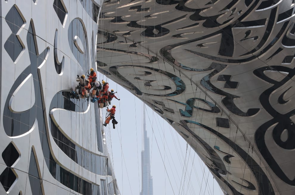 阿聯國內有90%的勞動力由外國人組成。本照攝於今年五月,為正在進行施工的杜拜未來博物館(Museum of the Future)。