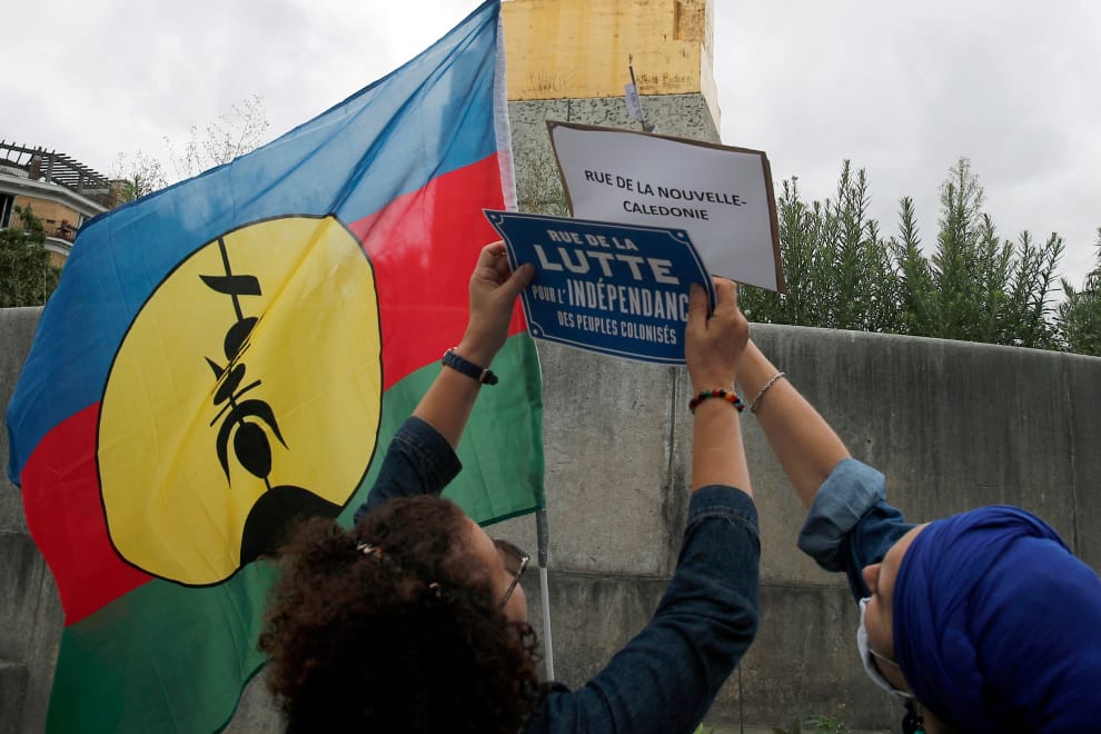 美聯社 / 達志影像本照攝於2020年7月5日,也就是新喀里多尼亞第二次獨立公投前三個月,在法國巴黎的移民博物館(Museum of Immigration)外,兩名反種族主義團體成員帶著象徵獨立的卡納克旗,將街邊路標從「法屬新喀里多尼亞」改成「為被殖民者的獨立而設的抗爭之街」。