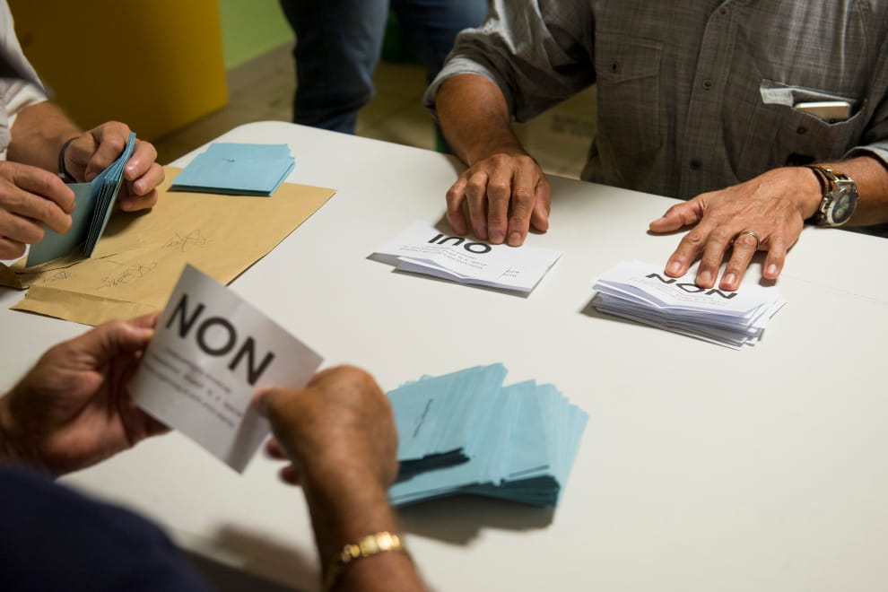 本照攝於2018年,在第一次獨立公投結束後,選務人員正在計票,其中,「NON」代表的是不要獨立,「OUI」代表的則是同意獨立。