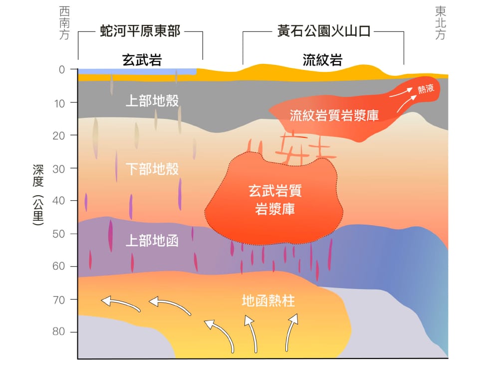 黃石公園岩漿庫之模型示意圖。2014 年時,在原本已知的流紋岩岩漿庫之下,大約地下 20 公里至 45 公里處,黃信樺找到了另一個更巨大的玄武岩岩漿庫,登上《科學》期刊。