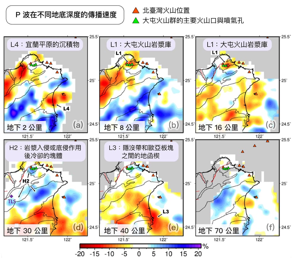 以 2 公里深為例(上圖 a),可以看到大面積的紅色、藍色對比,其中藍色代表中央山脈,也就是很硬的變質岩;而紅色是西部麓山帶,屬於較軟的沉積岩,並包含林口臺地(很厚的紅土層)、臺北盆地(沉積物)等明顯的地質構造特徵;東方小塊的紅色,則代表宜蘭平原的沉積物。