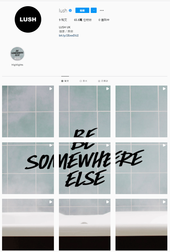 目前,在Lush英國的Instagram帳號上,已經只剩下由九則貼文拼成的「去他處」(Be Somewhere Else)。