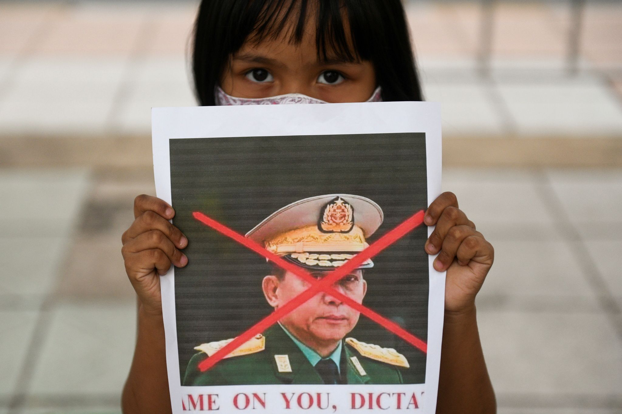 自今年2月緬甸軍方發動政變以來,克倫尼人與軍政府的衝突便不斷升級。本照攝於今年2月6日,大批緬甸人走上泰國曼谷街頭抗議政變,畫面中小女孩所持的肖像為軍政府掌權者,即緬甸國防軍總司令敏昂來(Min Aung Hlaing)。