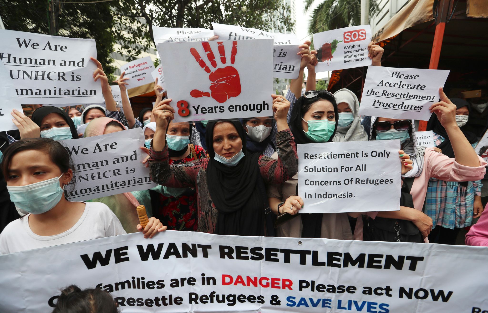 2021年11月15日,數百名居住在印尼的阿富汗難民,在位於雅加達的聯合國難民署辦事處(UNHCR representative office)外舉著海報抗議,要求當局加速安置的腳步。