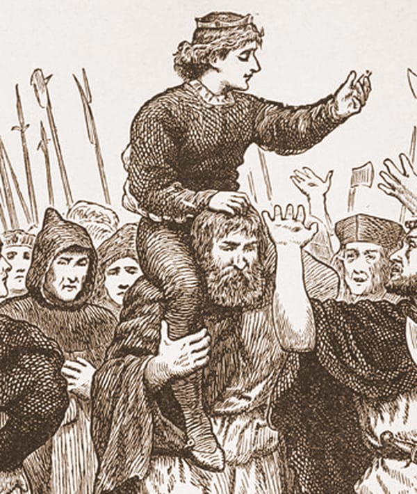 相傳皮爾島「加冕典禮」的由來,與15世紀一場失敗的政變有關。圖為西姆內爾坐在支持者肩上,抵達皮爾島的插畫。