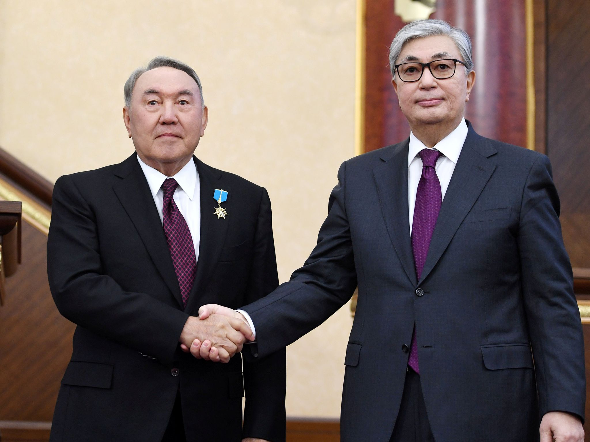 哈薩克前領導人納扎爾巴耶夫(左)與現任總統托卡葉夫(右),照片攝於2019年哈薩克議會兩院聯席會議。