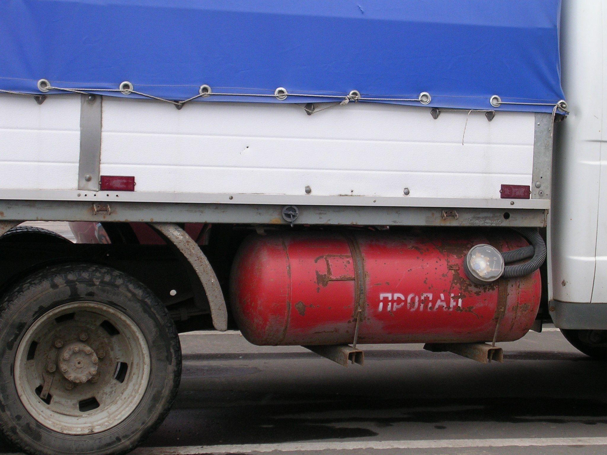 圖中為一台使用液化石油氣的車輛,紅色的即為液化石油氣鋼瓶。
