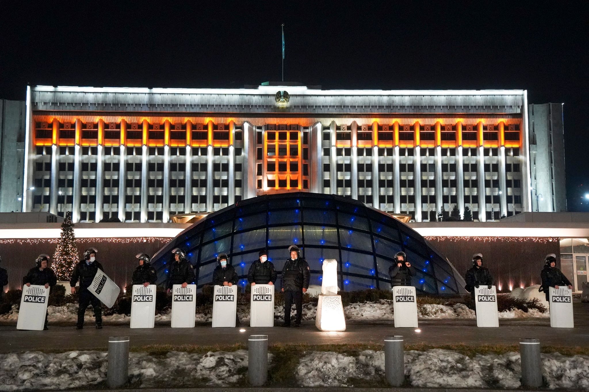 哈薩克大城阿拉木圖的抗爭行動中,大量警力被佈署在市長辦公室附近。