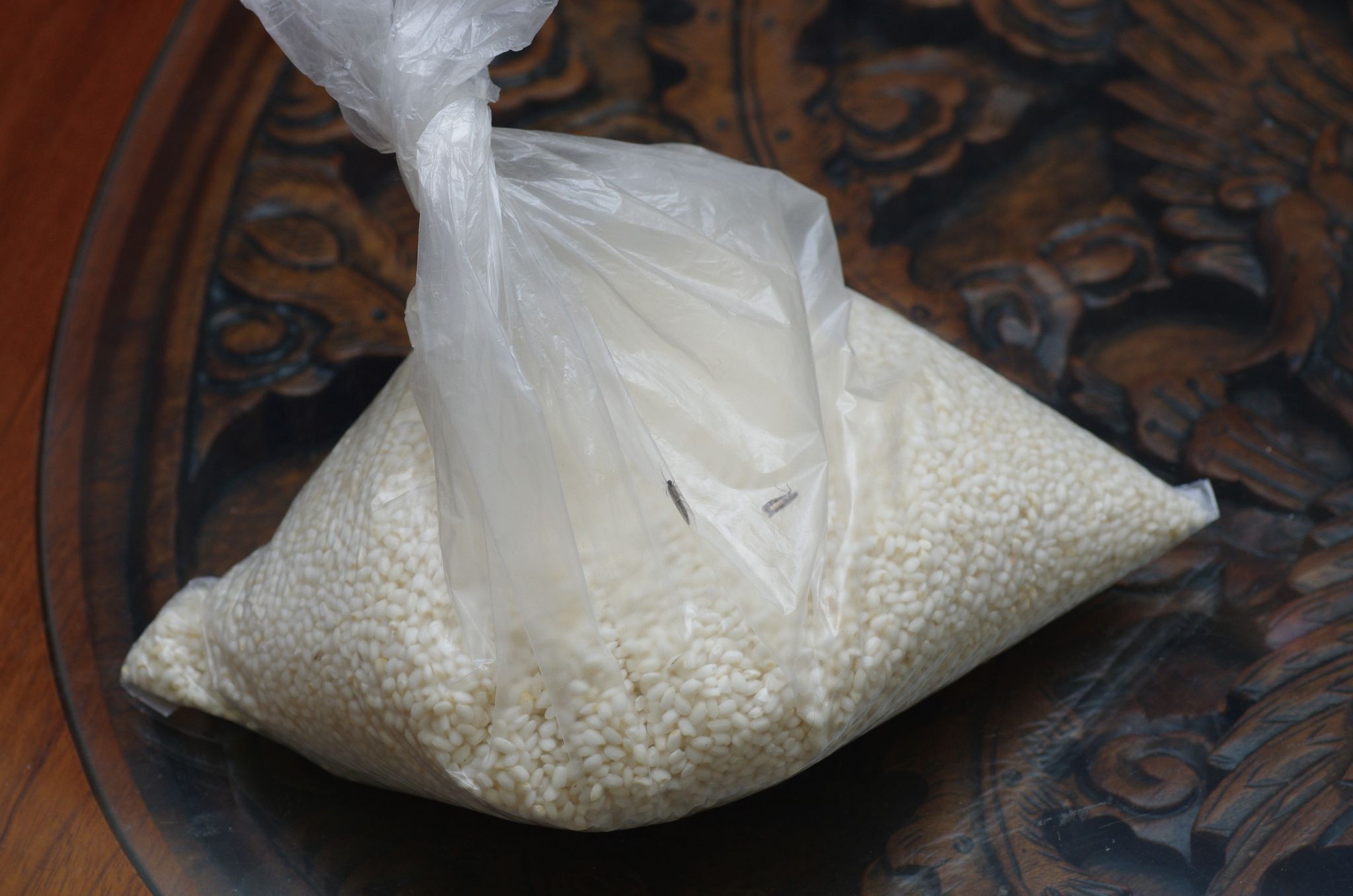 糙米中羽化出粉斑螟蛾的成蟲,由此可知商品在售出時裡頭即混有卵或幼蟲。