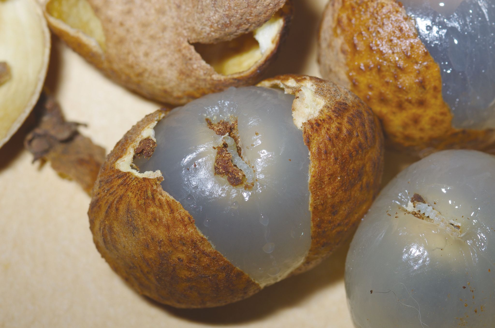 而一般在荔枝、龍眼這類無患子科水果果實裡常出現的,則是細蛾科的小型蛾類幼蟲,其中細蛾(Conopomorpha spp.)為常見種類。此外,市場買回來的香蕉,有時也會夾帶一些粉介殼蟲,不過這類蟲一般只會附著在果皮表面,不會接觸到果肉的部分。