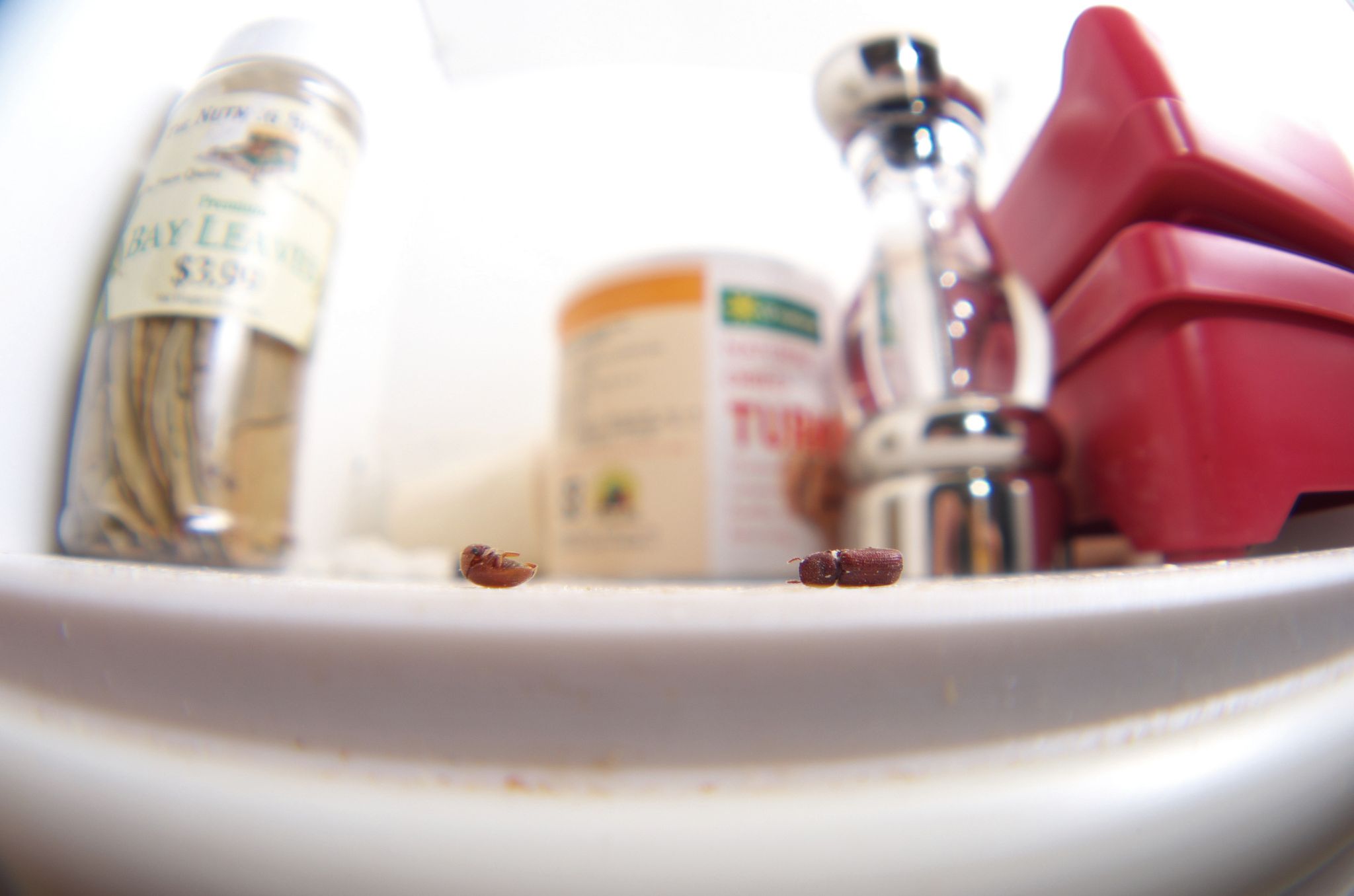 廚房櫥櫃中發現菸甲蟲及穀蠹屍體,牠們正是從食物裡跑出來的。