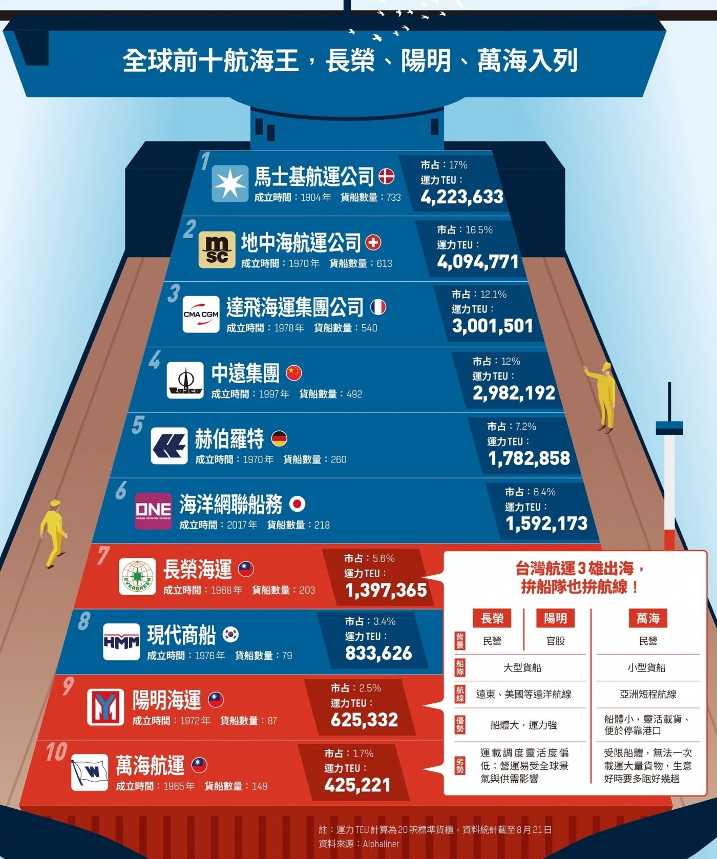 台灣是海運強國,根據航運市場研究機構Alphaliner排名,長榮(第7)、陽明(第9)、萬海(第10),運量都在全球前10大,三雄運力合計約占全球9.8%,約244萬TEU(20呎貨櫃)。