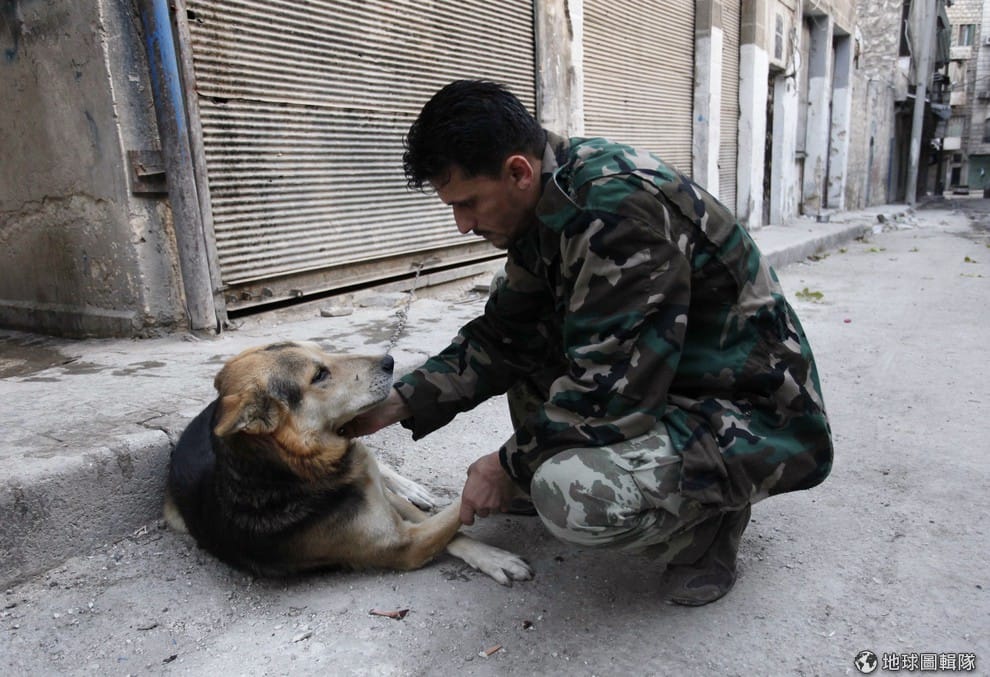 路透社解放敘利亞組織的人員摸摸路旁的狗。