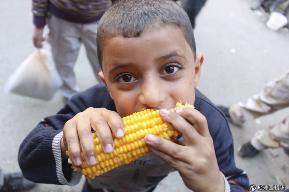路透社阿勒坡城中,小男生咬著玉米看鏡頭。