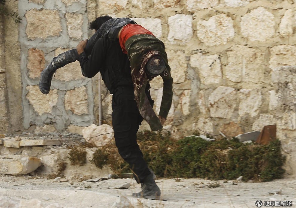 路透社反政府的解放敘利亞組織人員肩上扛著已經身亡的夥伴往另一邊衝,他們剛與政府軍發生衝突。