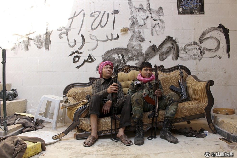 路透社阿勒坡舊城區中,年輕的解放敘利亞軍坐在沙發上拍照,後方的牆壁上寫著「神,敘利亞,自由」。