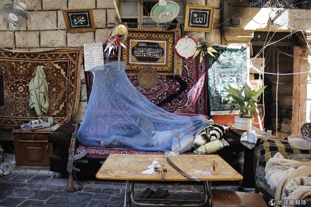 路透社阿勒坡舊城區中,休息中的解放敘利亞軍人躺在路旁椅子上。
