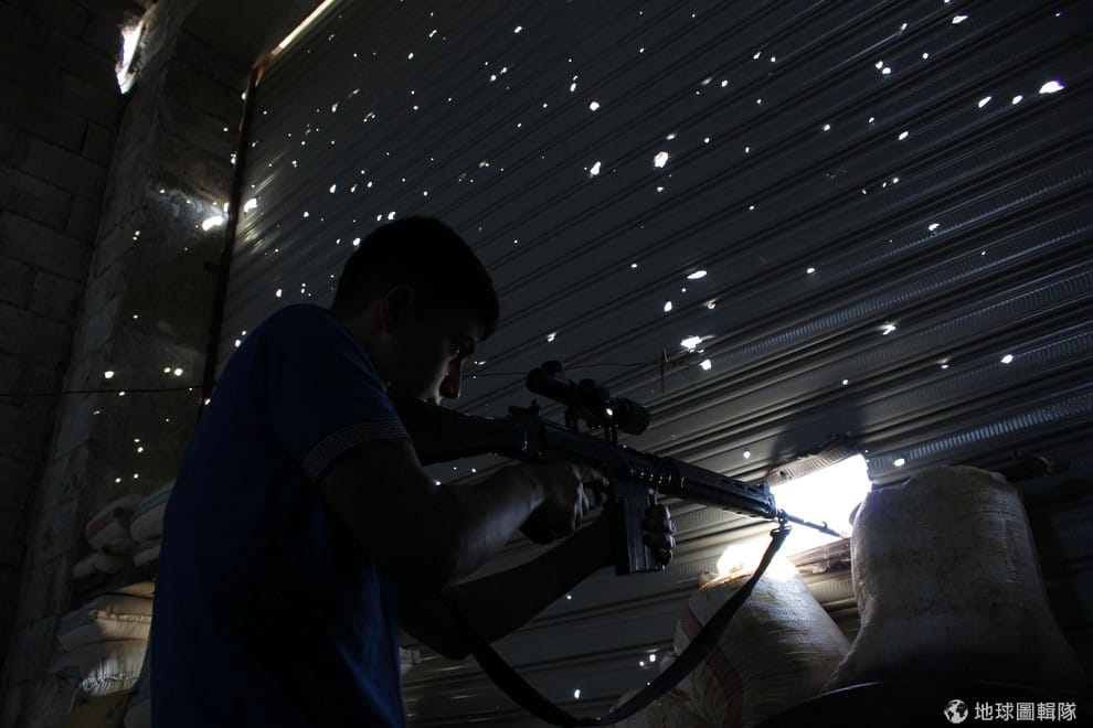 路透社阿勒坡大城中一處廢墟裡,可以看見反政府的解放敘利亞組織人員從牆上的洞向外瞄準。