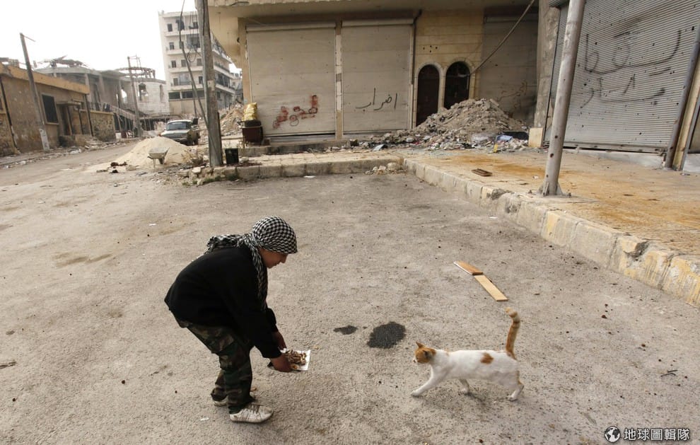 照片中是11歲的海珊(Hasan),他屬於反政府的解放敘利亞組織(Free Syrian Army)一員,他正在街旁餵一隻貓。