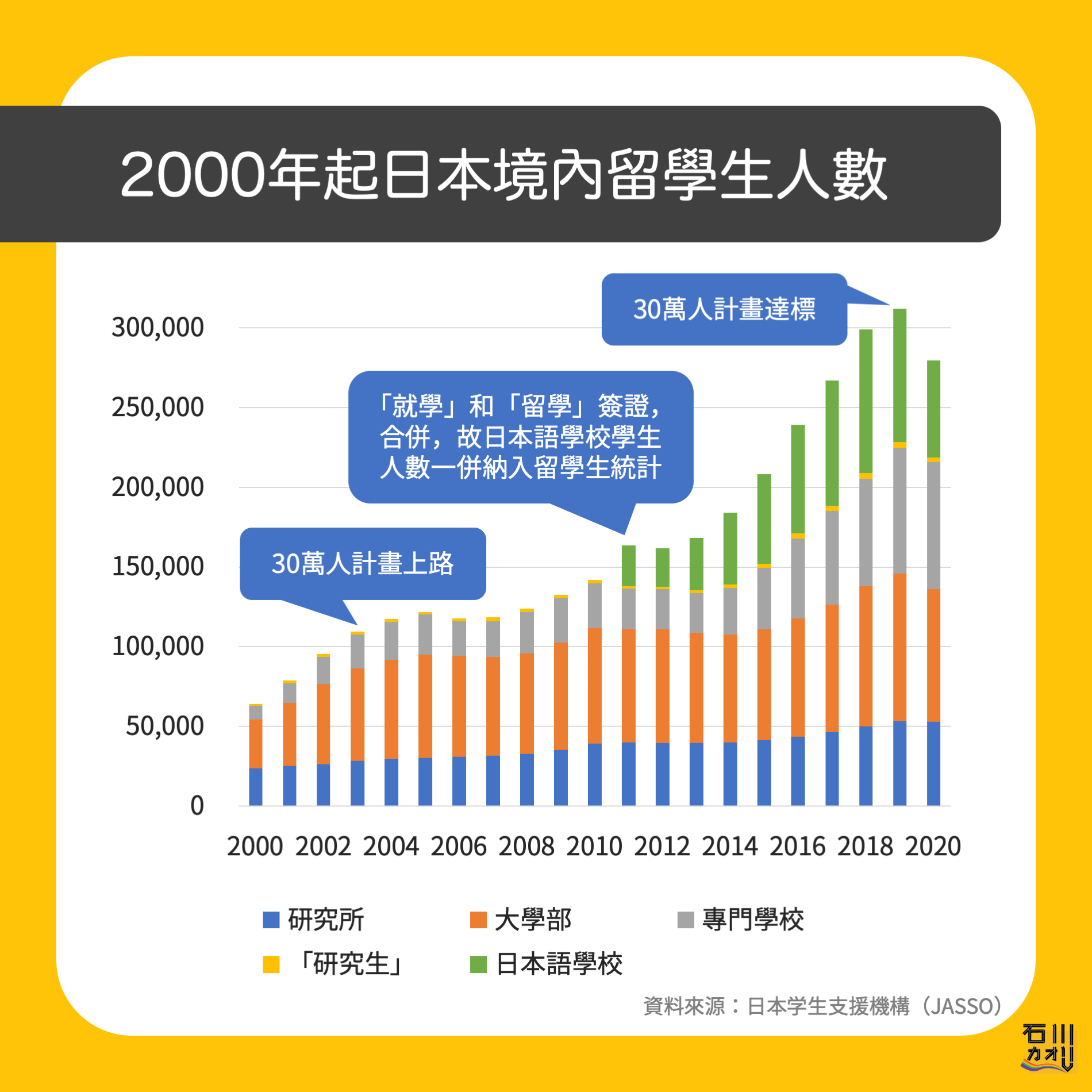 2010年,日本修改《出入國管理及難民認定法(出入国管理及び難民認定法)》時,將「就學」和「留學」簽證統一成「留學」。在這之後,留學生指的就是持有「留學」簽證的人,不論是就讀語言學校、專門學校,還是正規的高教機構,通通都是「留學生」。相較起來,修改了計算方式之後,境內留學生總數一定能比原本的計算方式來得高。