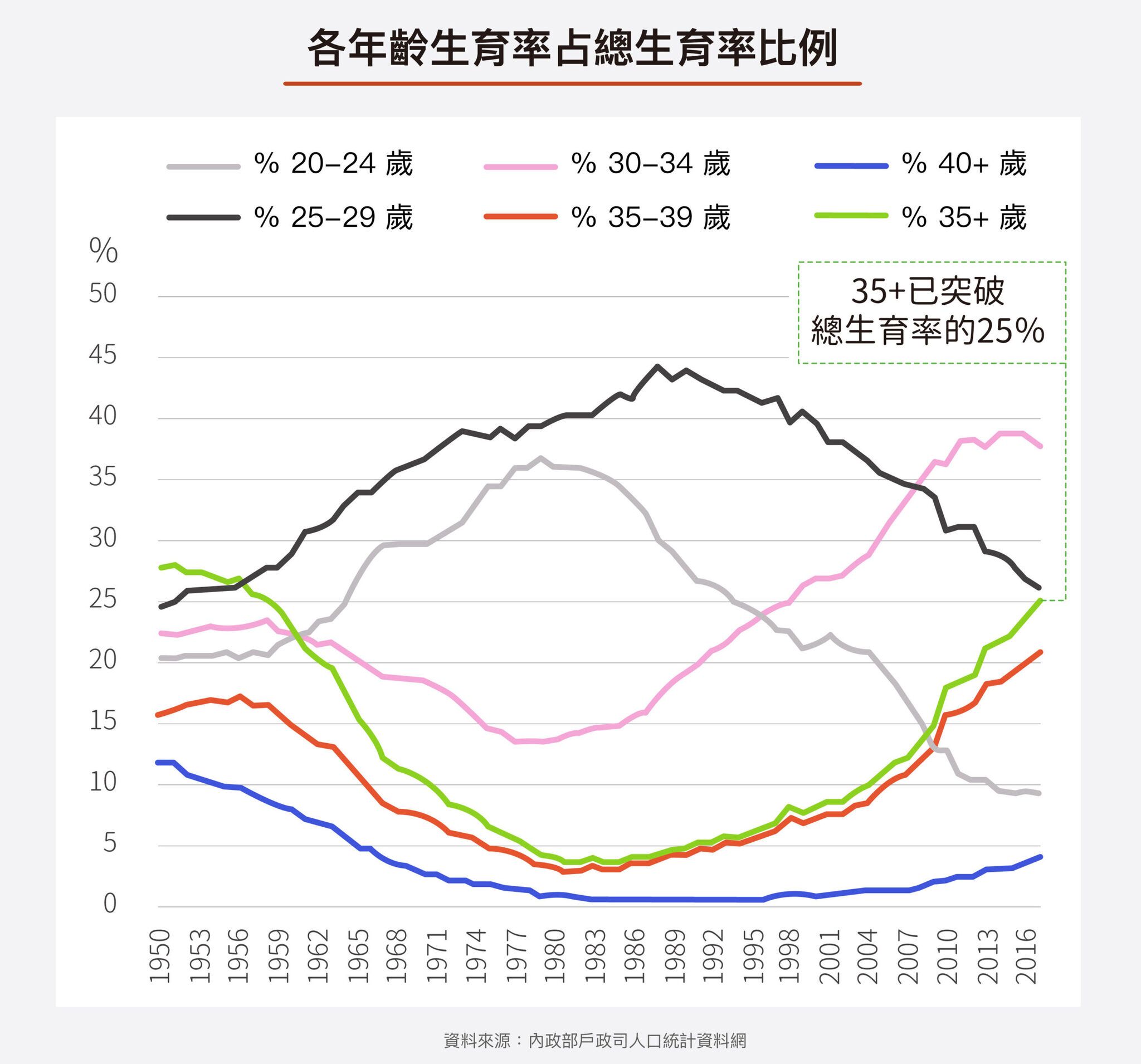 35 歲以上才晉升新手媽媽的比例快速竄升,2016 年已突破 25%。當晚婚、晚育成為常態,35-45 的女性勢必將成為臺灣的生育主力,這也考驗公衛與醫學體系是否能因應變遷,提供足夠的檢測照護與論述支持。