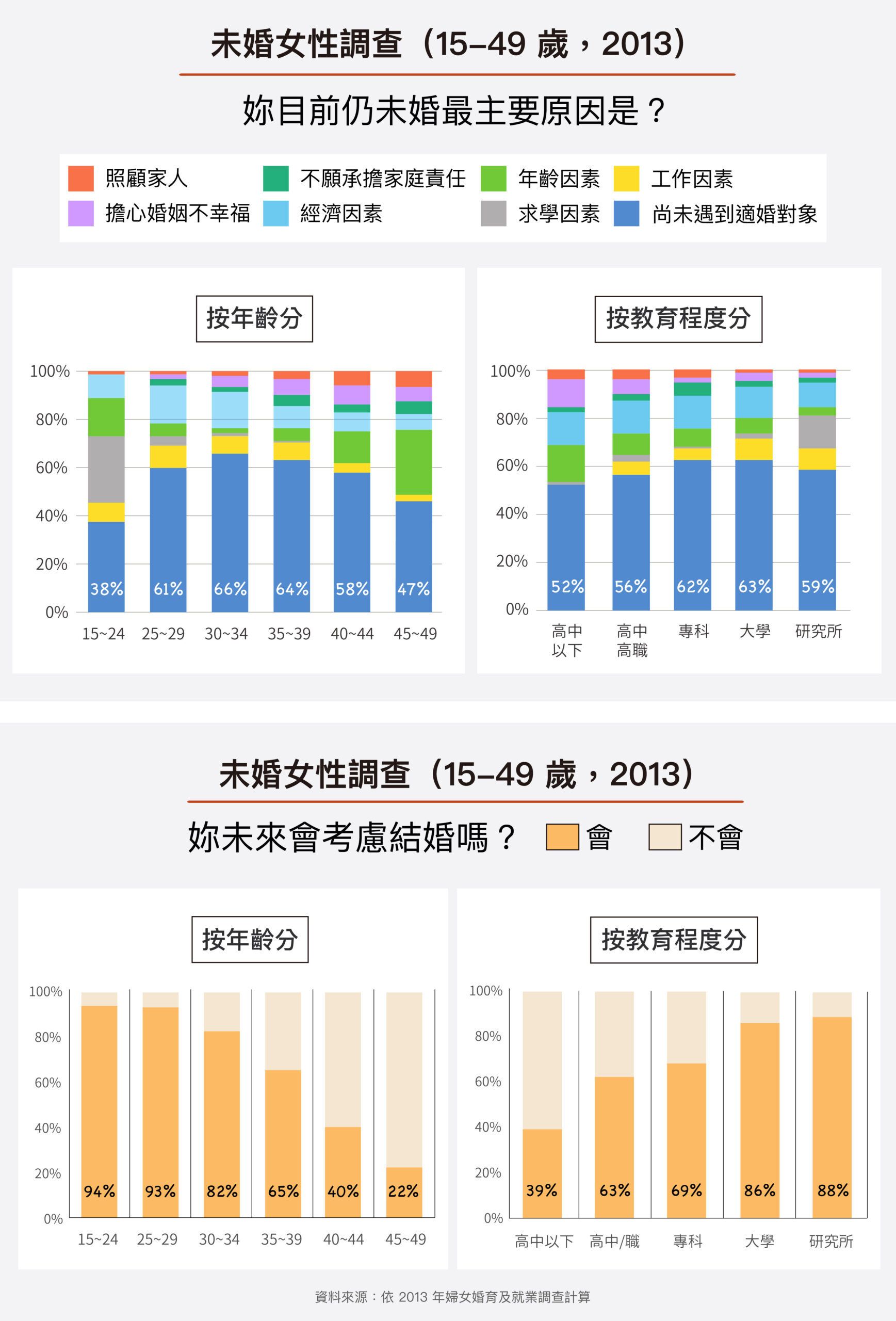 然而,許多單身者其實並非是不婚主義者。根據 2013 年主計處調查,未婚女性裡學歷越高、結婚意願越強,而且 45-49 歲仍有兩成考慮成家。那麼,她們單身的原因又是什麼?