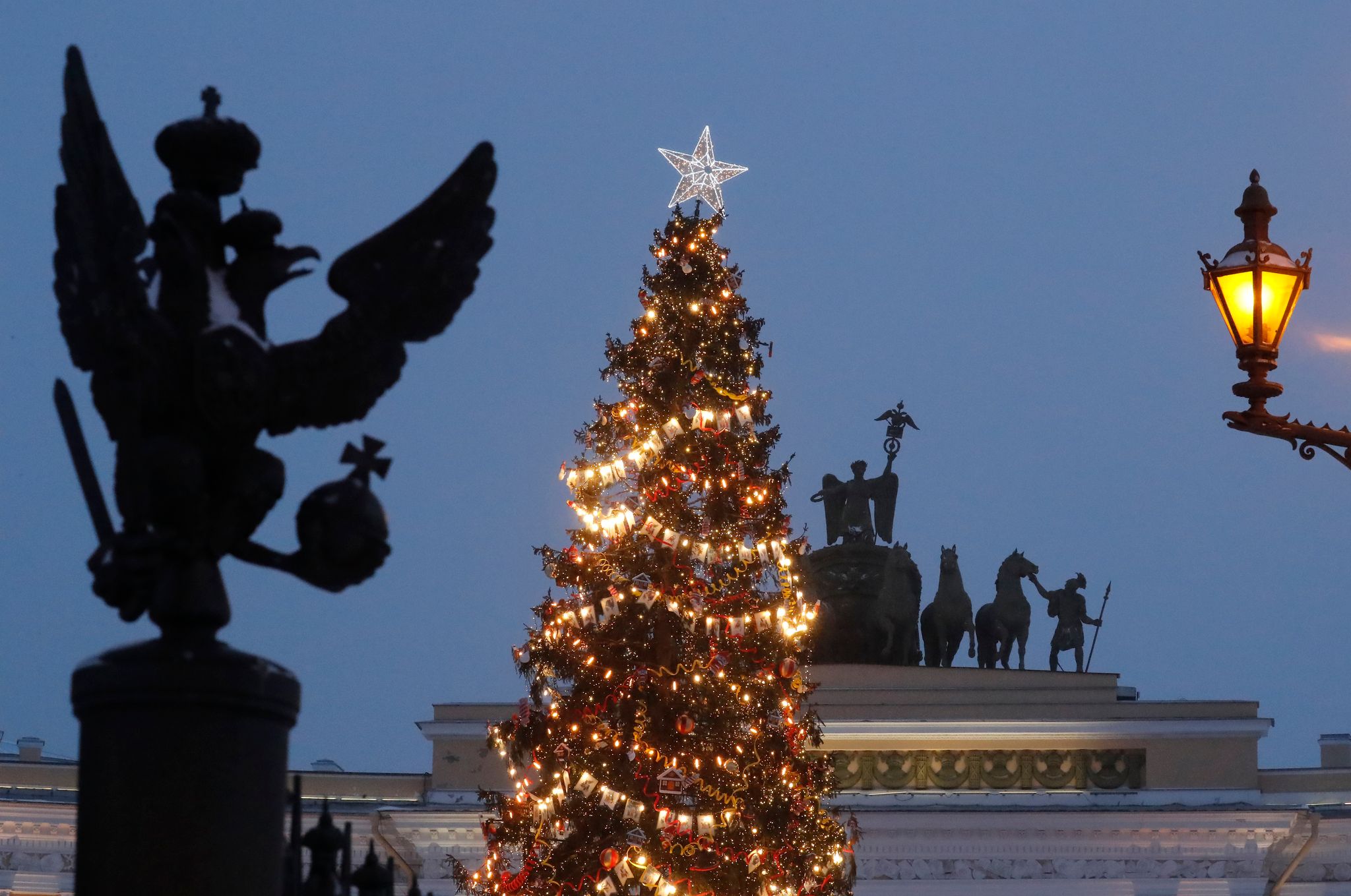 在赫爾比格的畫筆下,家中聖誕樹尖端的星星突然爆炸,為他開啟了一段大冒險之旅。圖為去年聖誕節期間,俄羅斯政府在聖彼得堡所立的一棵聖誕樹。
