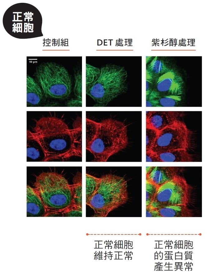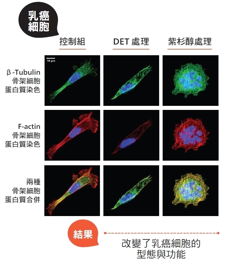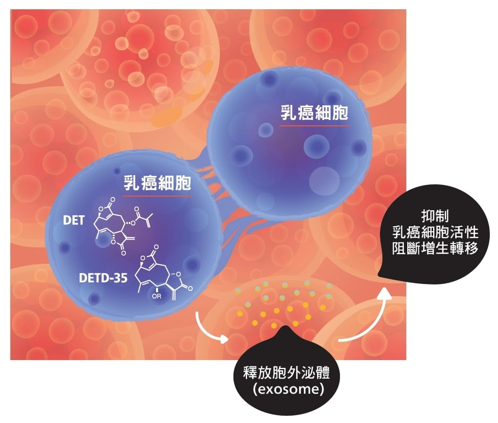 以胞外泌體(exosome)為例,它會把癌細胞的訊息物質傳遞給周遭「結構共犯」,助長癌細胞壯大增生。徐麗芬團隊蒐集乳癌細胞分泌的胞外泌體,發現使用地膽草DET處理癌細胞後,雖然胞外泌體變多,這些胞外泌體的蛋白質成分卻被改變了,反而會阻斷癌細胞與腫瘤微環境的訊息傳遞,包括抑制癌細胞本身活性、讓乳癌細胞不會增生與轉移。