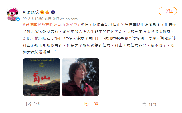 電影導演李楊隨後注意到電影《盲山》被網友大量轉發,他表示,為了讓婦女遭拐賣的議題獲得重視,即便盜版流竄,他也不會向盜版商收取版權費,希望能讓更多人有機會看到《盲山》,了解議題的嚴重性。