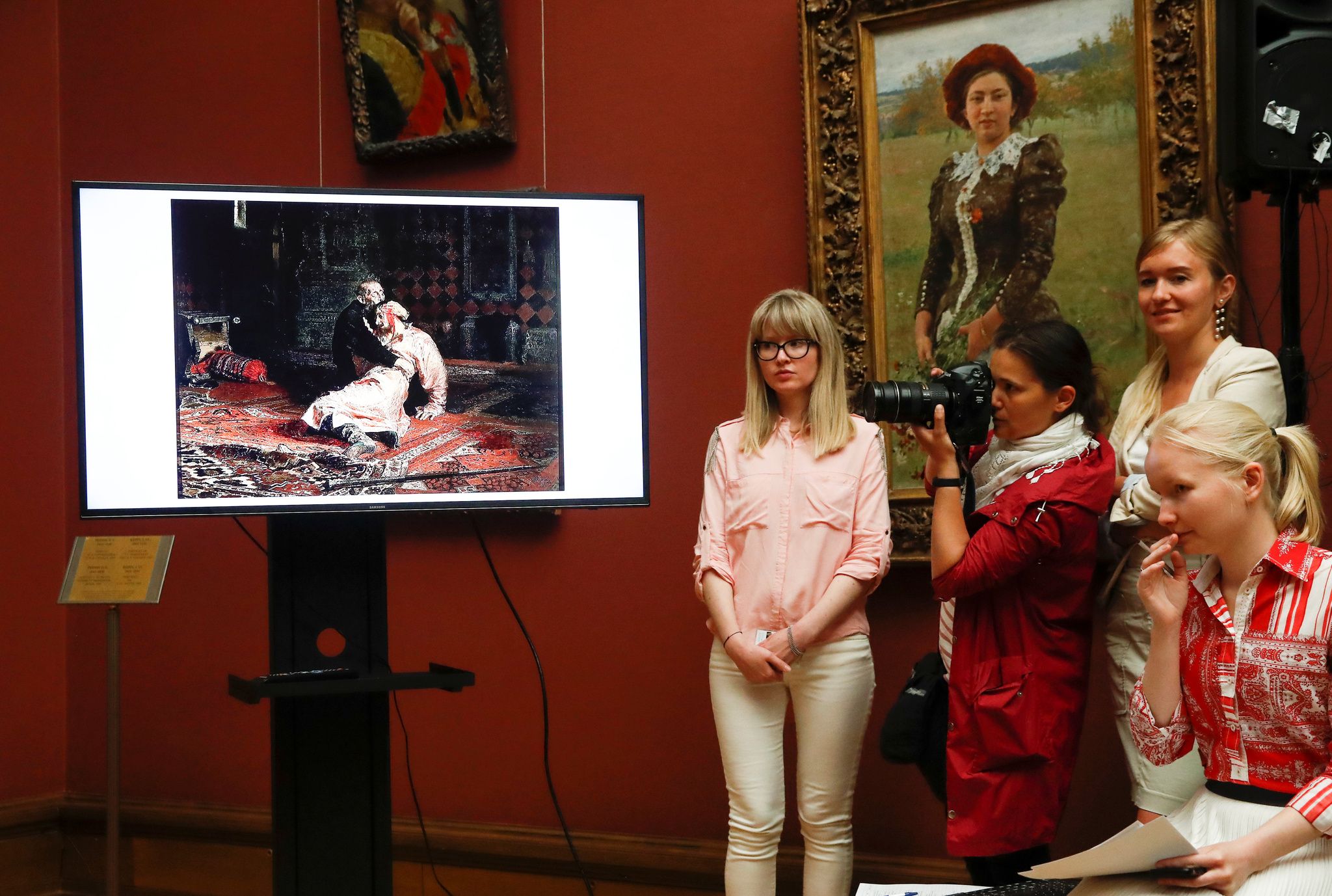特列季亞科夫畫廊記者會上展示被破壞的《伊凡雷帝殺子》畫作。