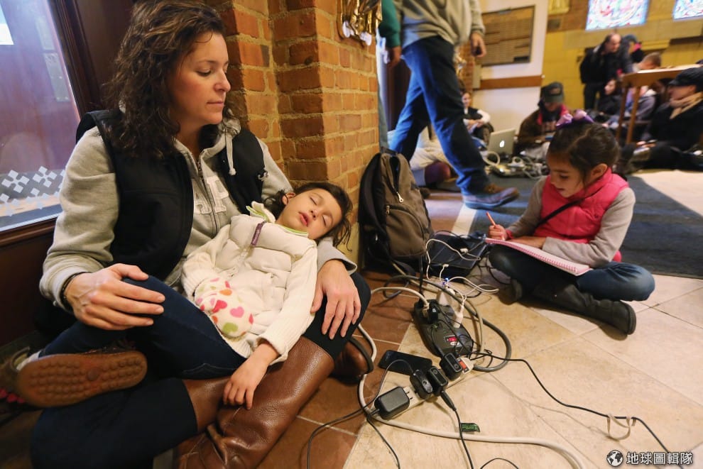 紐澤西的居民正在教堂內休息,順邊幫手機充電。圖片來源:Mario Tama/Getty Images