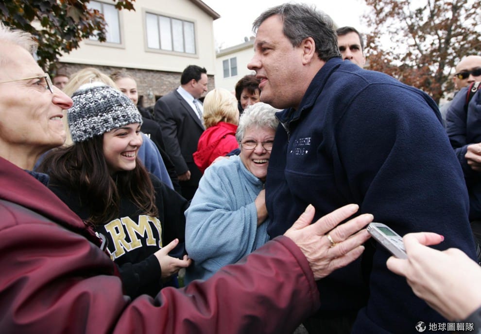 紐澤西州州長克里斯蒂(Chris Christie)探訪居民的情況,深受民眾歡迎的他,被老奶奶抱著不放。圖片來源:Kevin R. Wexler-Pool/Getty Images
