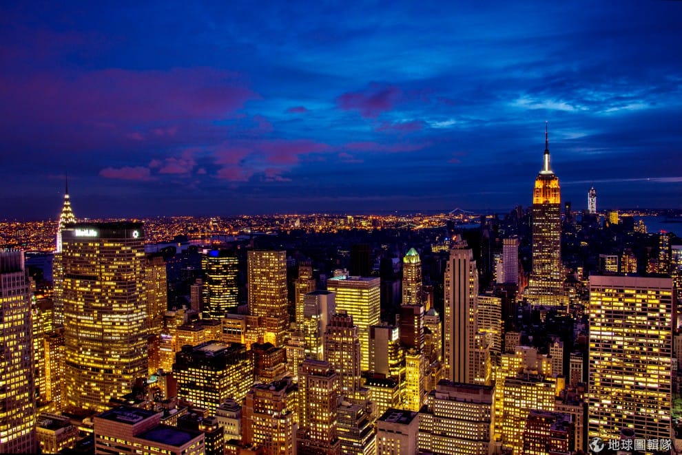 曼哈頓的市區在夜色中綻放光芒,但可以清楚看到下城區仍然是因為缺乏電力漆黑一片。圖片來源:Afton Almaraz/Getty Images