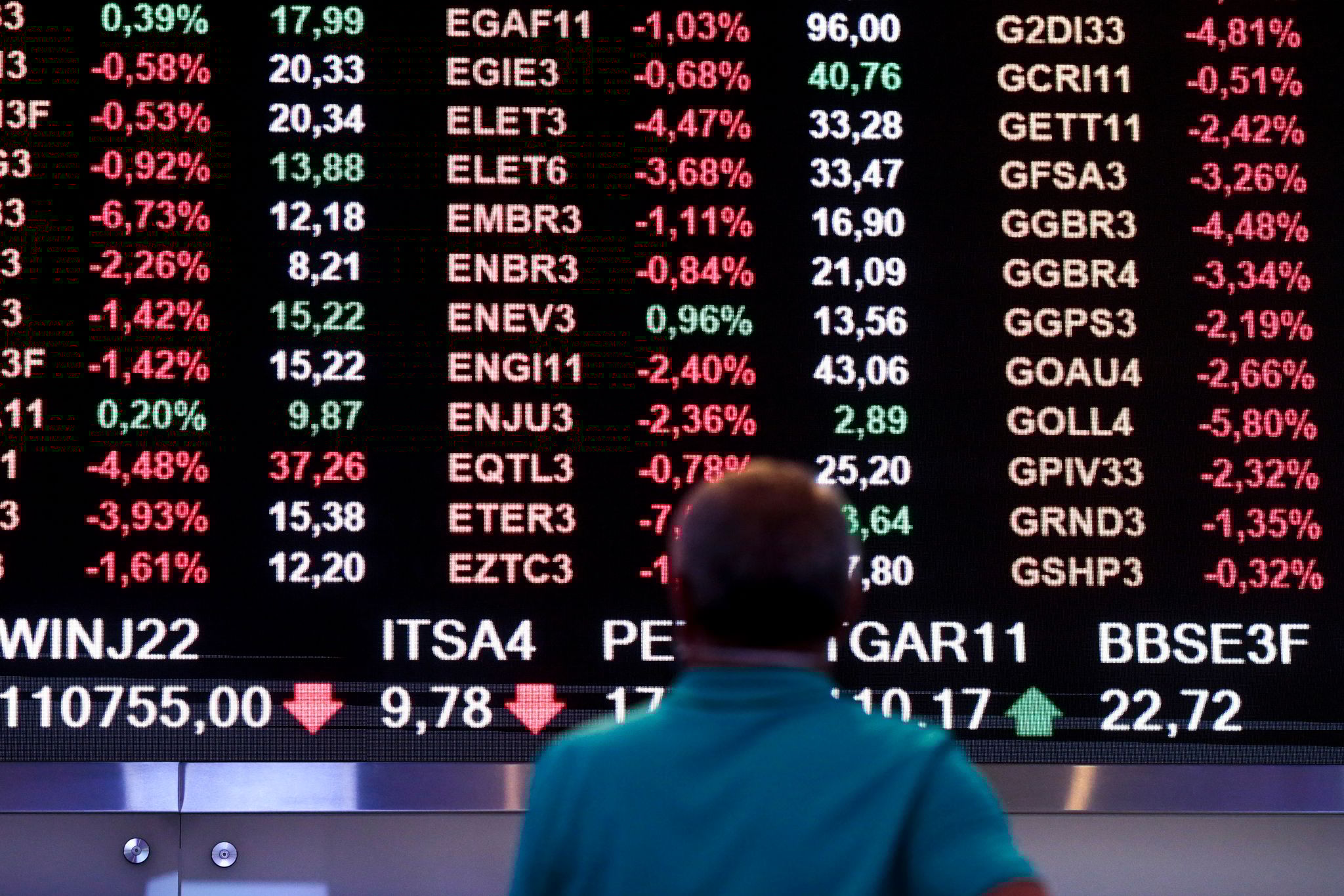 在周四俄烏衝突爆發當天,一位民眾站在巴西聖保羅市證券交易所的看板前關心金融市場的動向。