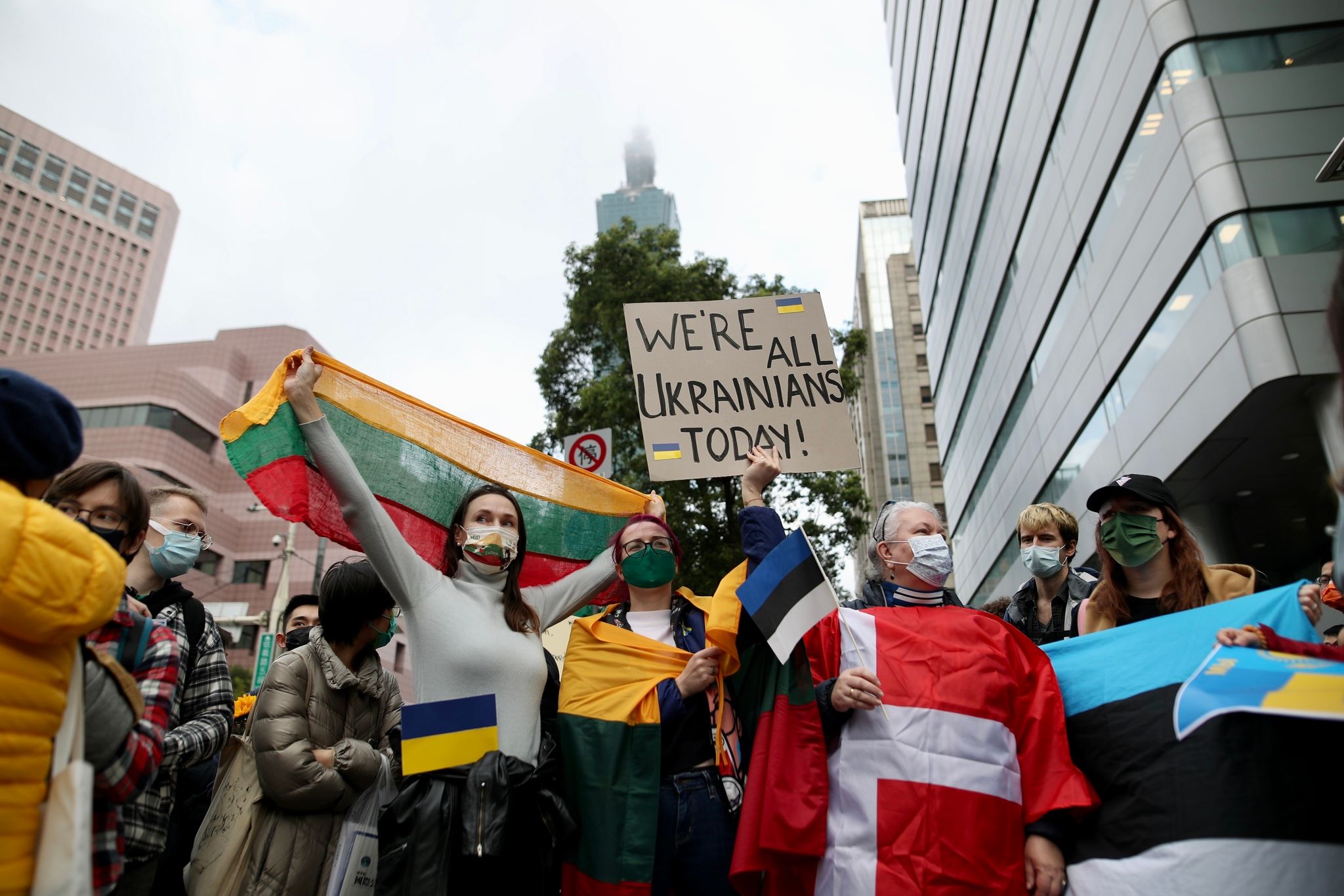 周五(25),許多人聚集在台北街頭,向發動戰爭的俄羅斯表達抗議。民眾手持的板子上寫著「今天我們都是烏克蘭人」。