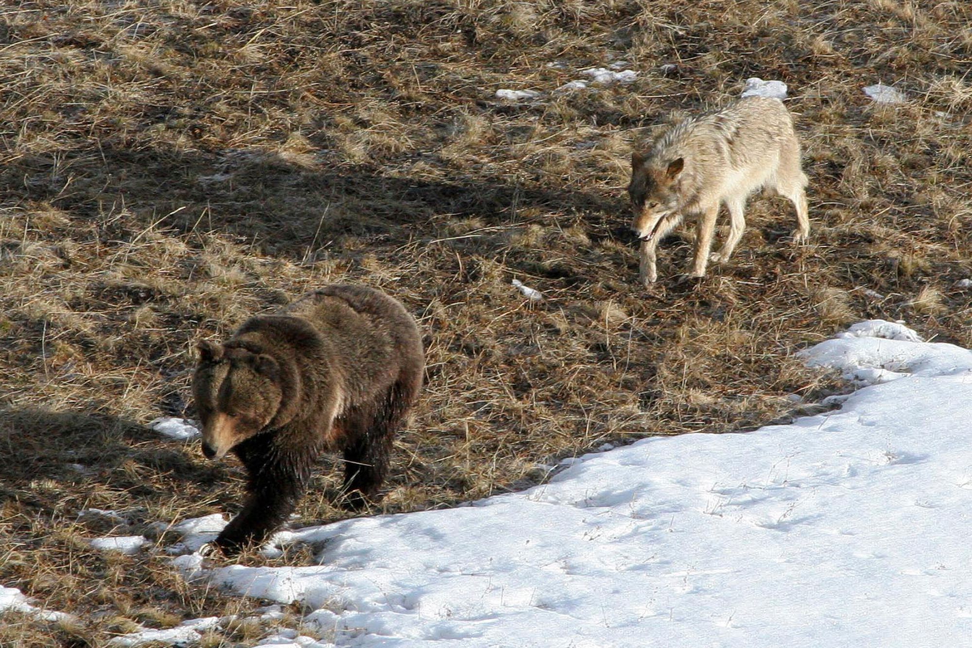 在黃石公園內,棕熊和狼都屬於頂尖捕食者,兩者之間有著競爭關係,但當熊和狼同時出現時,狼通常是受到影響的一方。